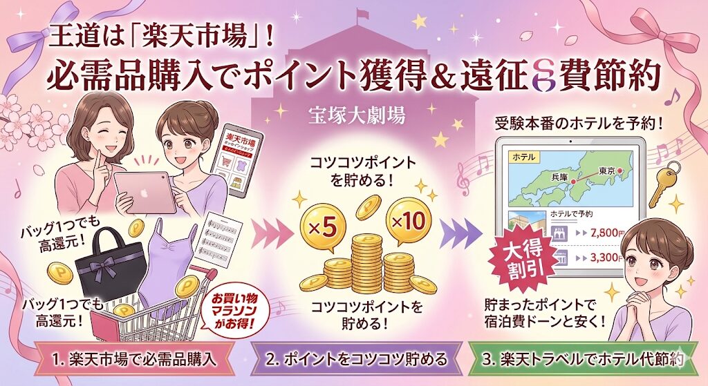今のうちからレッスンバッグやレオタードなどの必需品を「楽天市場」で購入してポイントをコツコツ貯めておけば、いざ受験本番のホテルを「楽天トラベル」で予約する際に、貯まったポイントを使って宿泊費をドーンと安く抑えることができます。