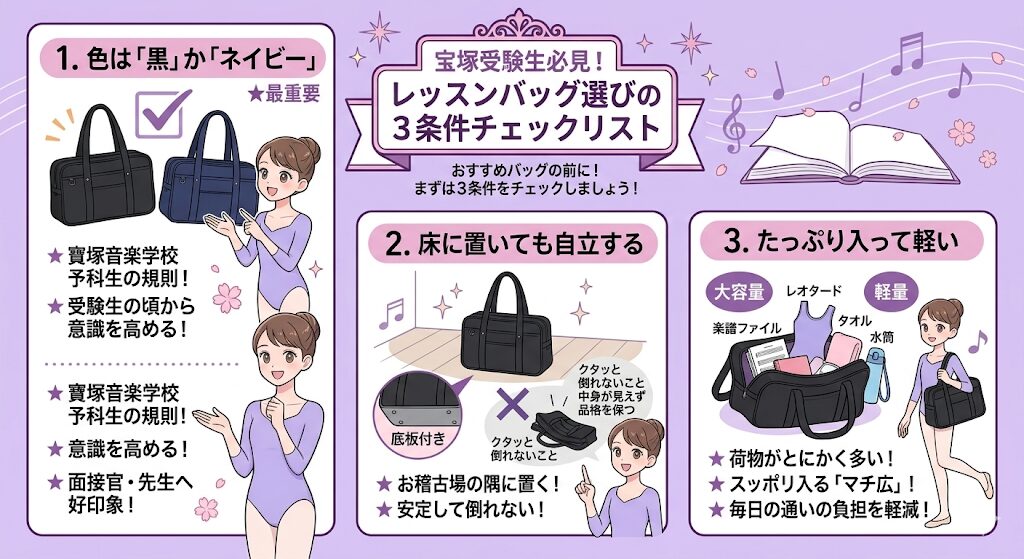おすすめのバッグをご紹介する前に、まずは「宝塚受験生ならではのバッグの選び方」について解説します。以下の3つの条件を満たしているか、必ずチェックしましょう!
