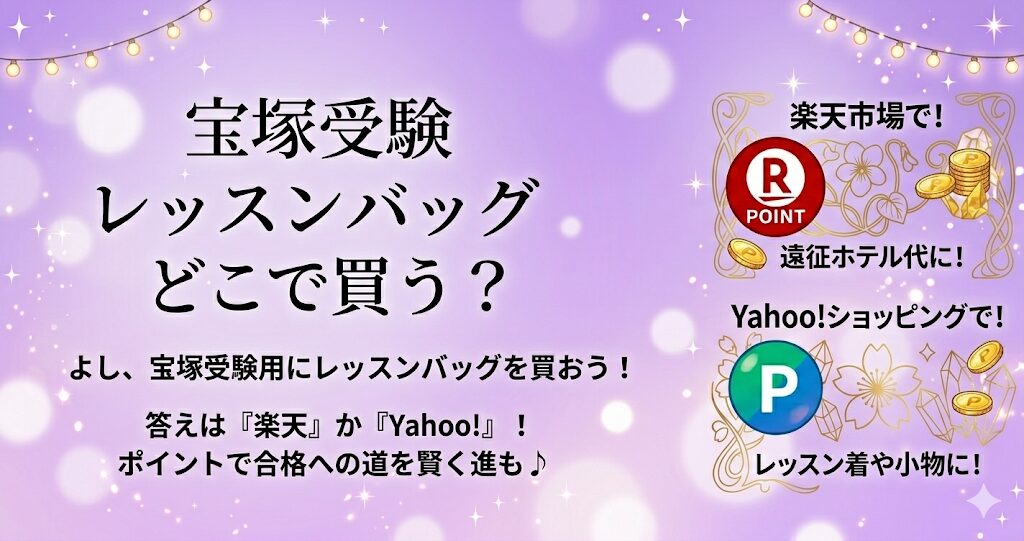 「よし、宝塚受験用にレッスンバッグを買おう!」と思った時、Amazonなど様々なネット通販がありますが、宝塚受験生(とくに親御さん)に一番おすすめしたいのは「楽天市場」か「Yahoo!ショッピング」での購入です。
